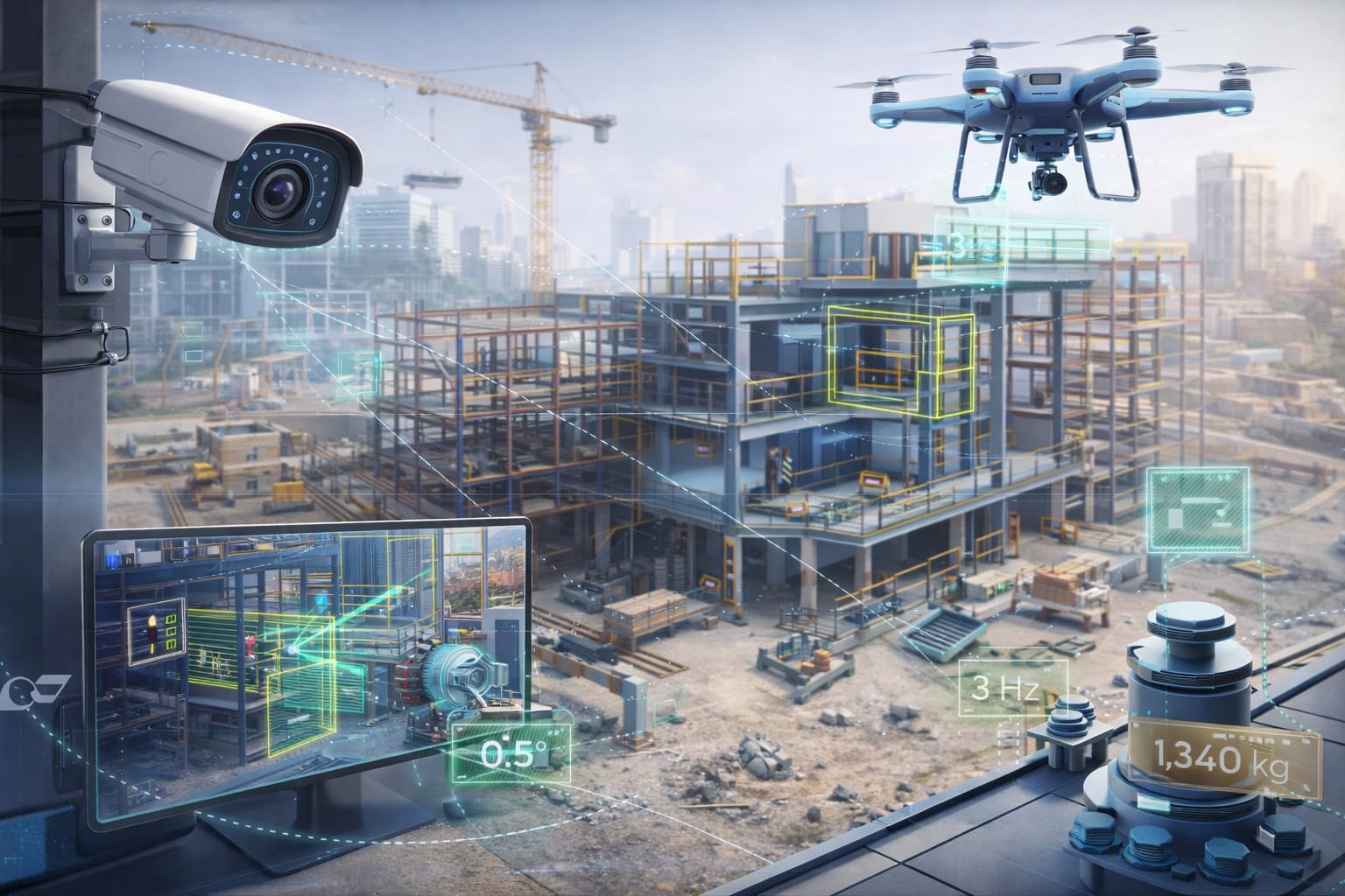 Construction site cameras, drones and IoT sensors capture real-time structural and environmental data. The system collects visual feeds, vibration signals and load measurements to monitor the physical condition of the project continuously.
