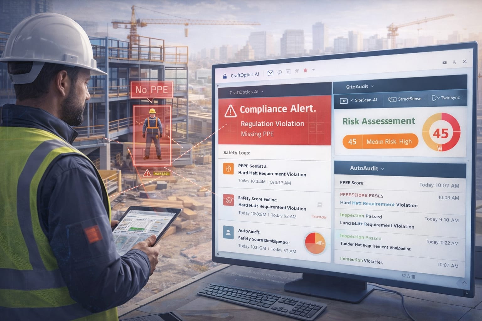 CraftOptics AI is a cyber-physical construction intelligence platform that combines computer vision, IoT telemetry and digital twin verification to monitor construction sites, detect structural risks and automate regulatory compliance in real time.