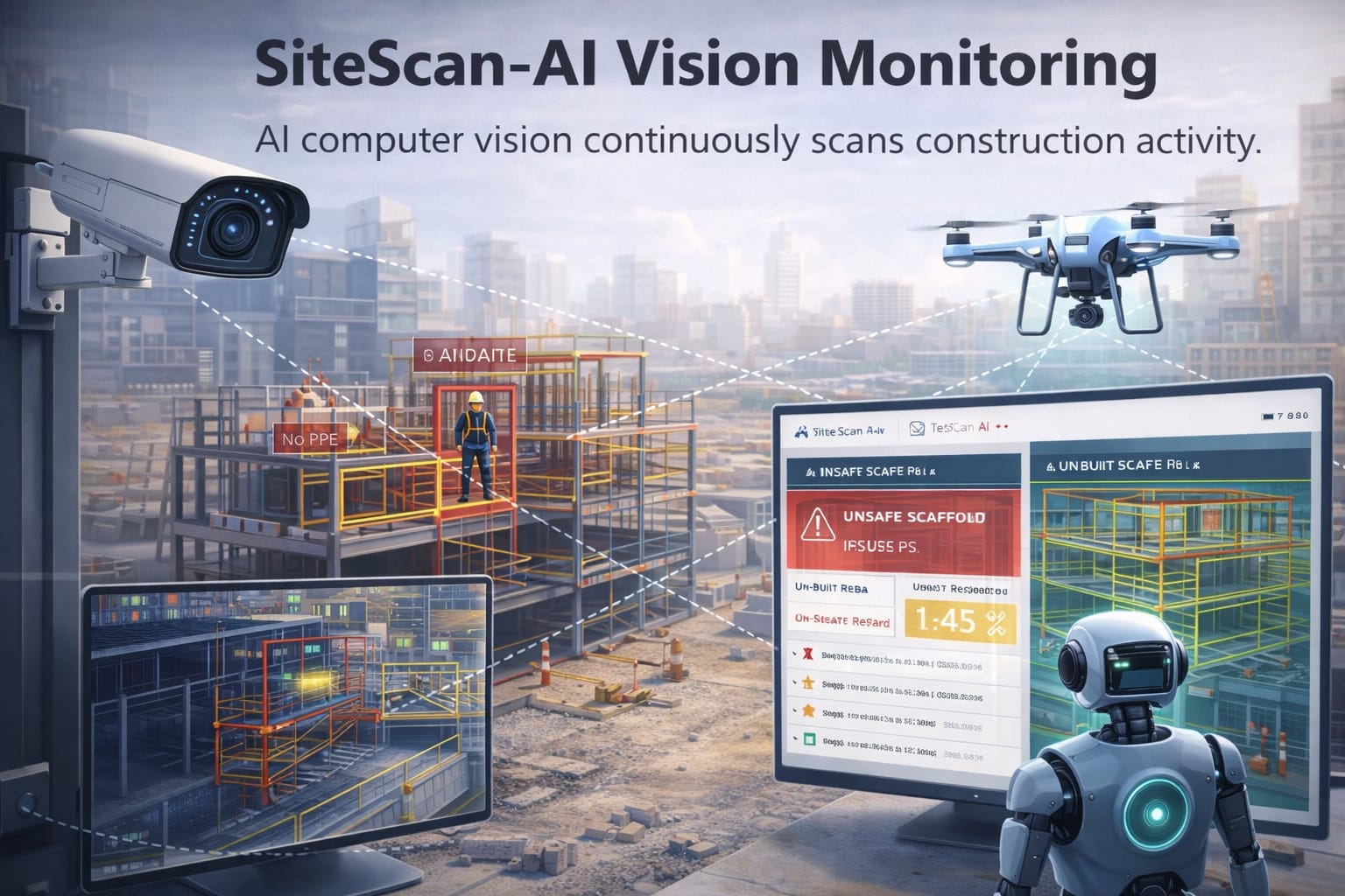 SiteScan-AI analyzes camera and drone footage to detect structural deviations, unsafe behavior and installation errors. The system automatically identifies issues such as missing PPE, incorrect reinforcement placement or unsafe scaffolding conditions.