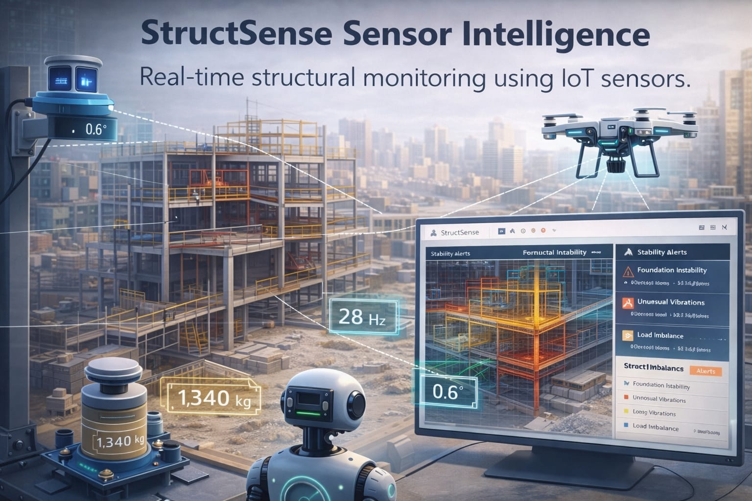 StructSense processes data from tilt meters, vibration sensors and load cells embedded in the construction site. The system detects foundation instability, abnormal vibration patterns and early structural stress signals before visible damage occurs.