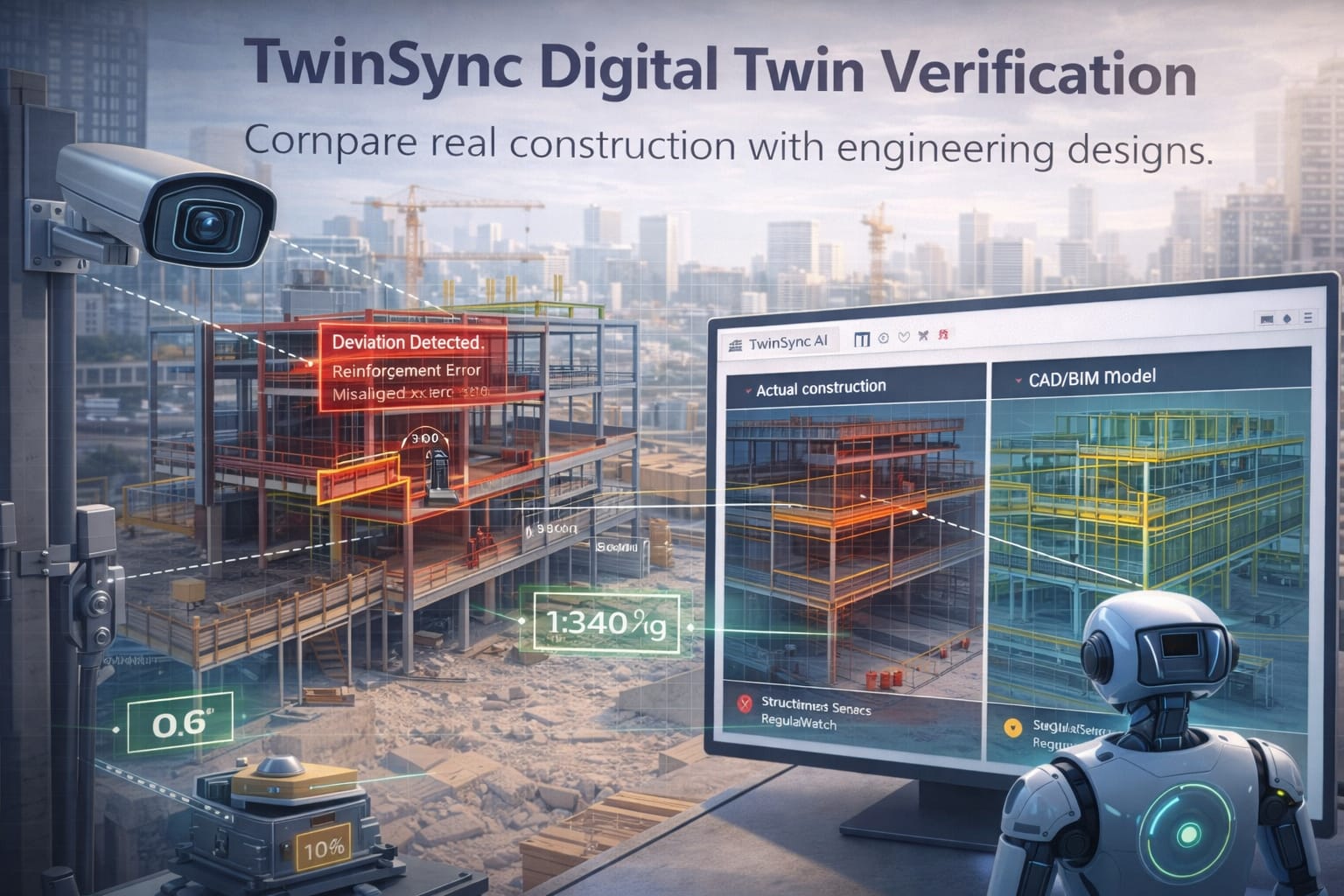AI compares real construction progress against CAD and BIM engineering designs through a digital twin model. Any deviation from approved structural specifications is instantly flagged for engineers and site managers.
