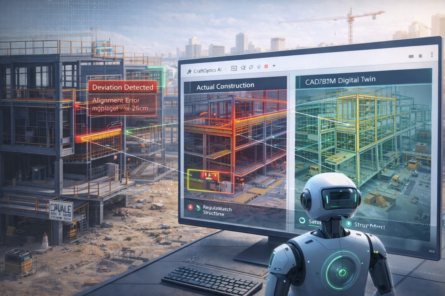 AI compares real construction progress against CAD and BIM engineering designs through a digital twin model. Any deviation from approved structural specifications is instantly flagged for engineers and site managers.