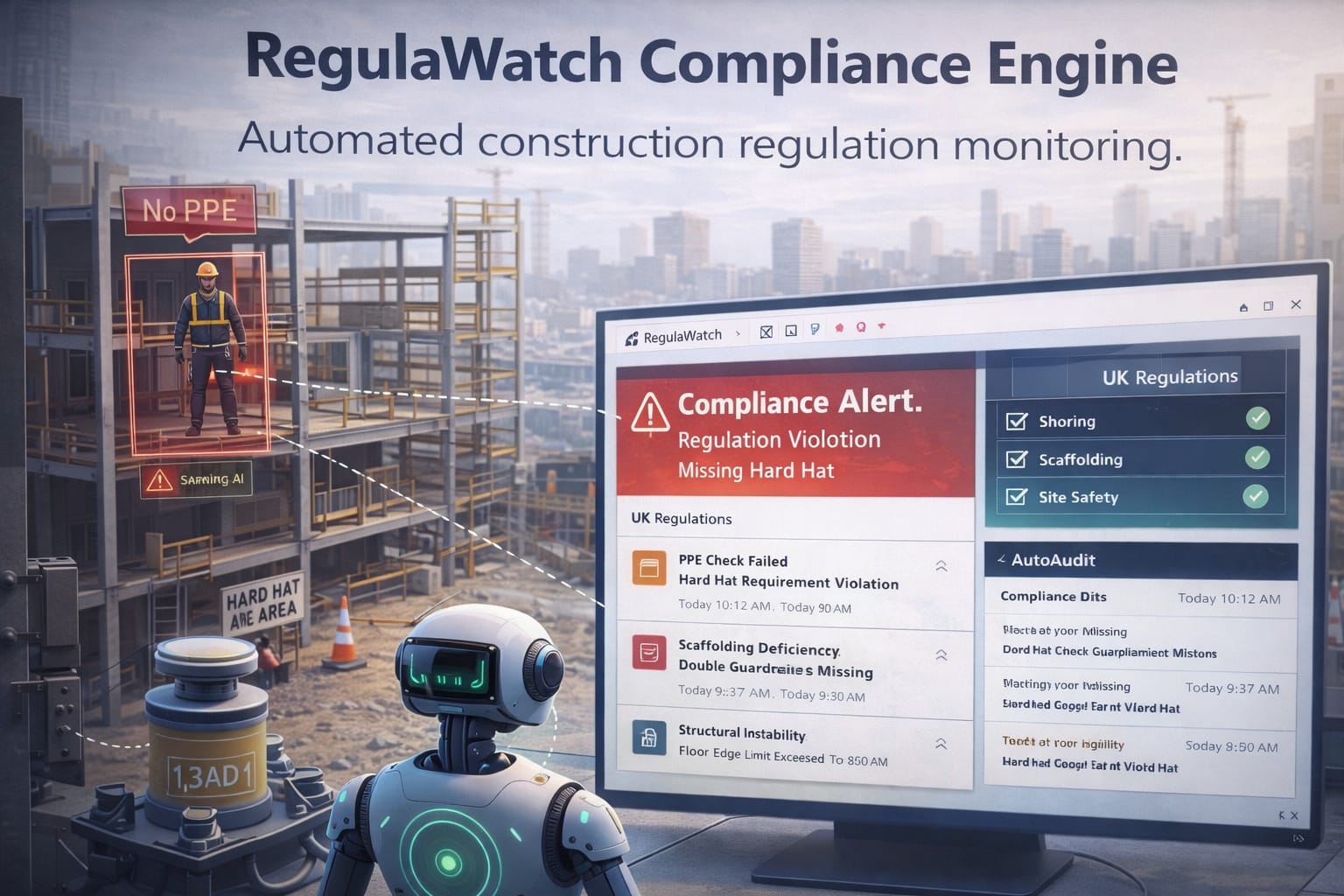 RegulaWatch digitizes UK building regulations and safety standards into machine-interpretable rules. The system continuously audits construction activity and generates alerts when compliance thresholds are violated.